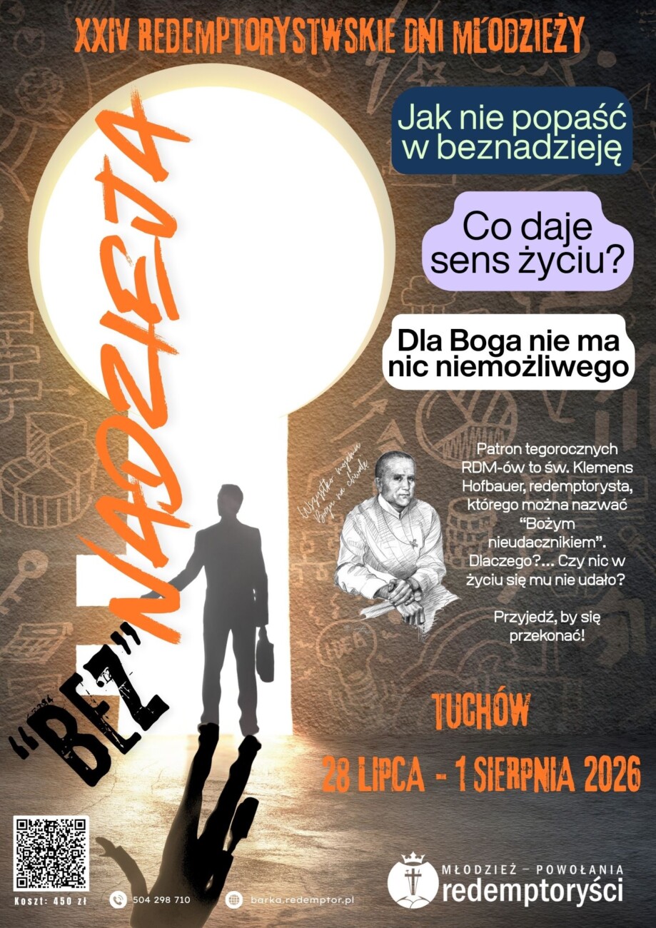 - Młodzież męską i żeńską 15+ ZAPRASZAMY na XXIV Redemptorystowskie Dni Młodzieży do Tuchowa w dniach 28 lipca – 1 sierpnia. Będą wspolne spotkania w grupach, koncerty i ciekawi goście, ale o tym więcej w następnych AKTUALNOŚCIACH.
